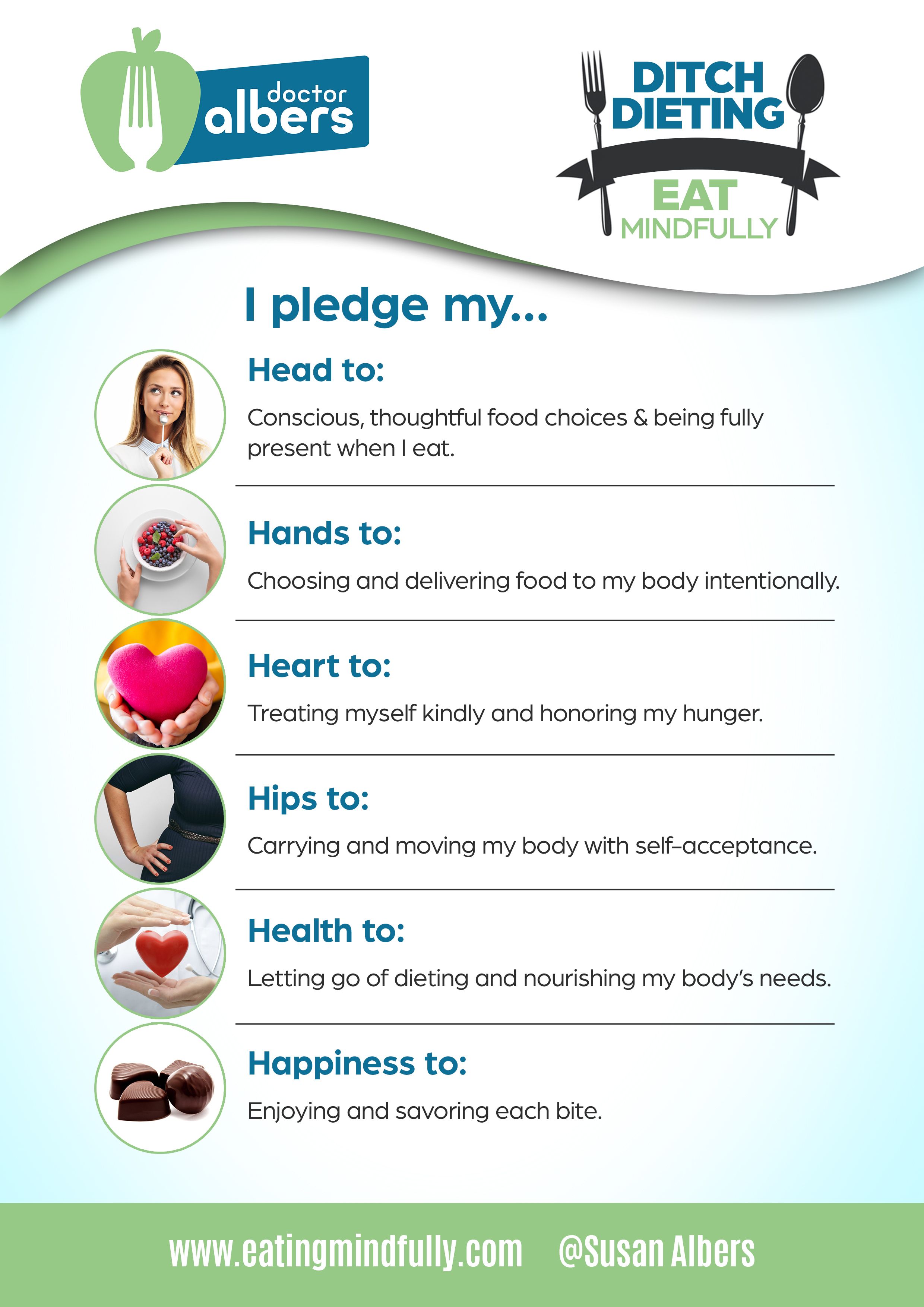 Click on the image to download a printable PDF of the pledge to hang on your refrigerator, cabinet, cupboard, bathroom mirror, or office door. Place it anywhere that you will see it. This will truly help you to interact with food in a mindful way!